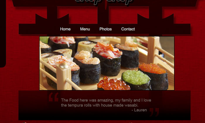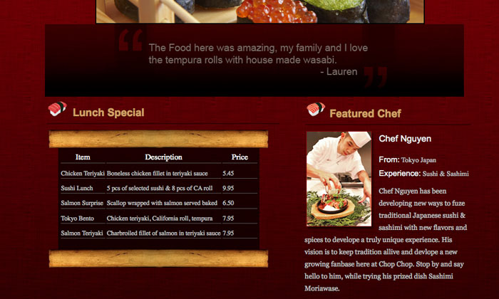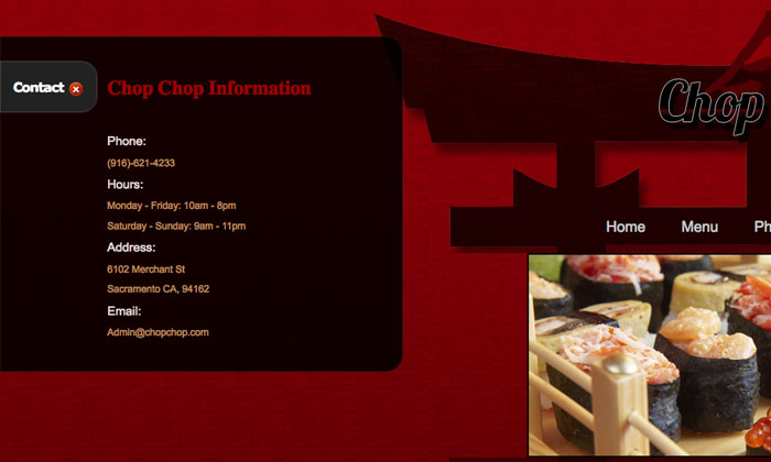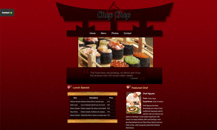 Chop Chop was my take on a local sushi catering business. The visual identity of this website needed to represent the same culture and professionalism that goes into their food. It focused on delivering a face behind the company through the featured chef section, as well as credibility through the customer testimonies. My interactivity came from a user enhanced photo slideshow, as well as a slide out contact feature.