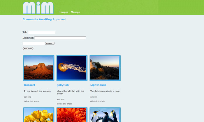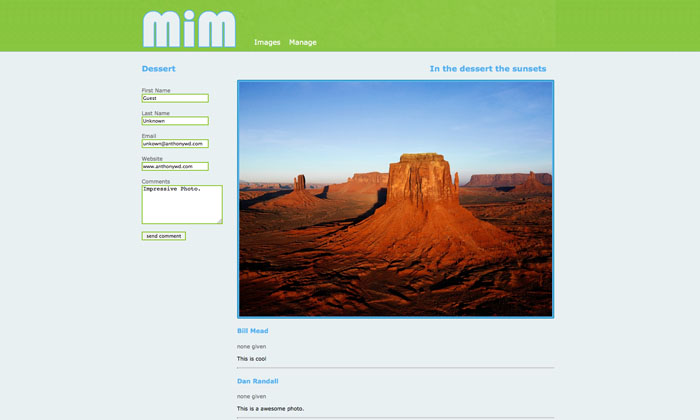 M.I.M (Multiple Image Media) allowed a user to login to a database and then upload / edit their photos. M.I.M provided guests the opportunity to post comments that where then held in a capture query, until the photo admin determined if the comment should be approved or not.